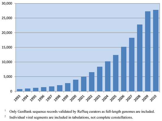 Spurred by increasingly inexpensive technologies, the pace of virus genome sequencing has risen sharply in the past decade (see Figure 1). Currently, there are 27,091 full-length virus genomes deposited in GenBank (see Table 1), and these are distributed among 2,500 distinct viral taxonomic groups [1]. Impressive as this is, the number of sequenced viral genomes is expected to grow rapidly over the foreseeable future as genome sequencing methodologies are utilized in viral discovery and surveillance efforts.