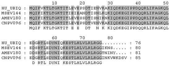 Ubiquitin homologs have recently been identified in the genomes of poxviruses [21,22,23]. Two insect poxviruses: Melanoplus sanguinipes (MSEV) (Table 1) [21] and Amsacta moorei (AMEV) [22], as well as canarypox virus (CNPV), contain virus-encoded ubiquitin homologs [23]. Genomic analysis of MSEV, a poxvirus that infects locusts, identified the open reading frame MSEV144; encoding an 80 amino acid protein that is 86% identical to human ubiquitin (Figure 1) [21]. However, the role that MSEV144 plays during viral infection has not been characterized. BLAST analysis also identified an additional poxvirus-encoded ubiquitin gene AMEV180, in AMEV, a poxvirus that infects moths. AMEV180 is 81 amino acids in length and 89% identical to human ubiquitin (Figure 1) [22]. Sequencing of canarypox, a poxvirus that infects song birds, identified another ubiquitin homolog, CNPV096, in canarypox virus (Figure 1) [23]. At 85 amino acids in length, CNPV096 contains all of the residues required for protein ubiquitination and is 98% identical to human ubiquitin [23]. Interestingly, fowlpox virus (FWPV), a close relative of canarypox virus, contains fragmented remains of a functional ubiquitin gene [24]. MSEV144, CNPV096, and AMEV180 are not part of the polyubiquitin gene class, and do not encode ribosomal peptides at the C-termini. In contrast to eukaryotes, which have multiple copies of ubiquitin-encoding genes, only one copy of each ubiquitin gene is present in the genomes of these viruses [21,22,23]. Virus-encoded ubiquitin genes have also been identified in Baculoviridae, a family of dsDNA viruses that infect insects [25]. Disruption of the ubiquitin gene in Autographa californica nuclear polyhedrosis virus (AcNPV) has no effect on virus viability, however, a decrease in virion budding and total infectious particles was observed [25]. Whether the ubiquitin-encoding genes in MSEV, AMEV, and CNPV are required for productive infection or virion budding remains to be determined.
