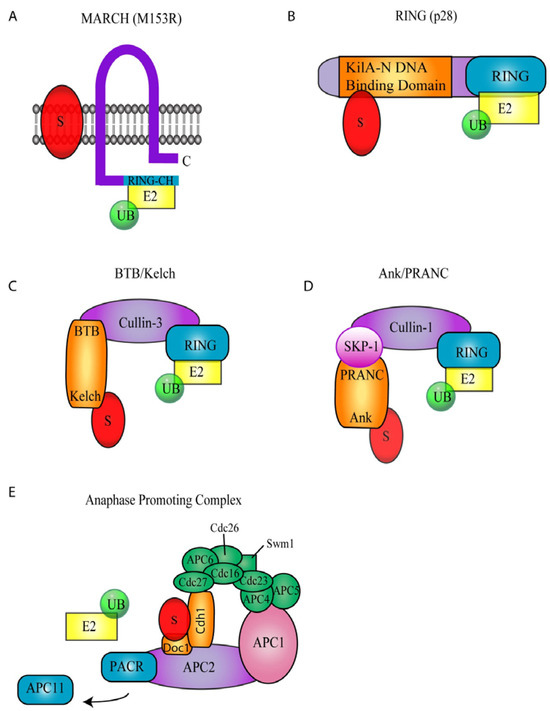 Poxviruses encode two families of proteins with intrinsic ubiquitin ligase activity; a membrane-associated RING-CH (MARCH) ubiquitin ligase, and a really interesting new gene (RING) finger protein (Figure 2A and B) [35,36,37,38].