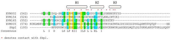 Sequence alignment of ectromelia virus encoded Ank/PRANC proteins with cellular Skp2: AlignX was used to align the C-termini of EVM002, EVM005, EVM154, and EVM165 with the N-terminal F-box domain of Skp2, a cellular F-box protein [89]. Red dots indicate known contact points between Skp2 and Skp1 [59]. H1, H2, and H3 represent alpha-helical secondary structures from Skp2.