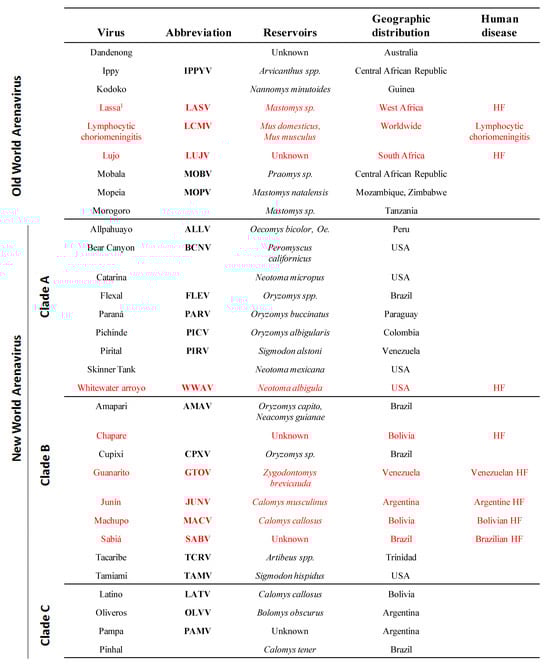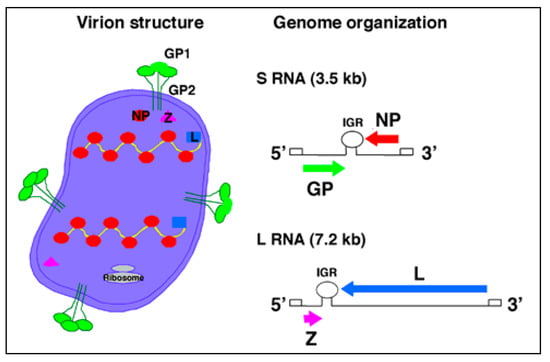 - Buchmeier, M.J.; de la Torre, J.C.; Peters, C.J. Arenaviridae: The viruses and their replication. In Fields Virology, 5th ed.; Lippincott Williams & Wilkins: Philadelphia, PA, USA, 2007; Volume 2, pp. 1791–1827. [Google Scholar]