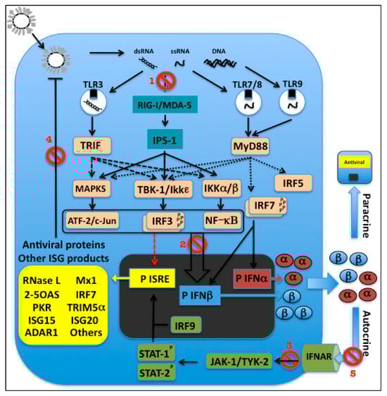 - Gale, M.J.; Sen, G.C. Viral evasion of the interferon system. J. Interferon Cytokine Res. 2009, 29, 475–476. [Google Scholar] [CrossRef]