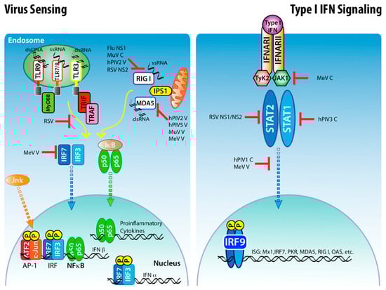 Respiratory paramyxoviruses can inhibit the IFN signaling pathway. The C protein of hPIV1 inhibits the translocation of STAT-1 and STAT-2 to the nucleus and the activation of IRF-3 [,], while the C protein of hPIV3 inhibits the phosphorylation of STAT-1 []. Some evidence suggests the C protein of MeV acts to inhibit IFN signaling response []. The V protein of MeV appears to form complexes with different signaling proteins in the IFN response pathway preventing either nuclear translocation or their phosphorylation [,,,,,]. The NS1 and NS2 proteins of RSV can both block type I IFN and IFN-λ responses [,]. It is thought that STAT2 is actually degraded by NS1 and NS2 [] (Figure 1).