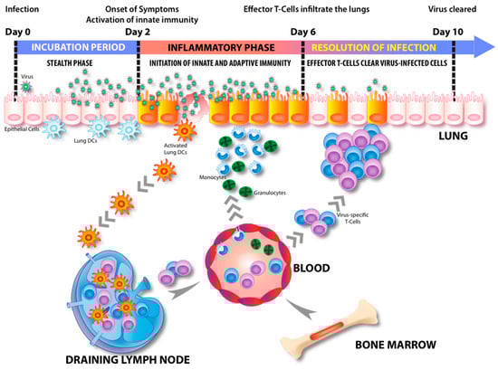 In vivo, lung secreted cytokines and chemokines also promote systemic awareness to the virus infection. Type I IFNs can signal to developing leukocytes and memory T cells in primary and secondary lymphoid organs such as the bone marrow and spleen to acquire an anti-viral state and enhance their function [,]. Such an anti-viral state is thought to functionally improve cells of the immune system before they infiltrate the lungs. Type III IFNs are also induced after respiratory virus infection and likely limit virus spread in epithelial cells []. Therefore, type III IFN might be induced at the end the of the stealth phase complementing the function of type I IFN. The speed at which this process occurs is controlled by the ability of the virus to suppress inflammation. This observation points out that immune modulation by the pathogen not only targets local lung immunity but also the external intervention of pre-programmed leukocytes with advantageous antiviral machinery.