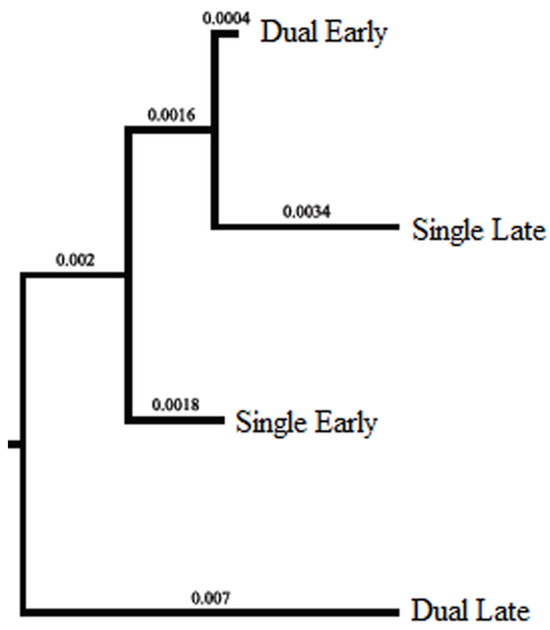 The Bayesian skyline analysis suggested that the viral populations in each infection environment could be temporally structured. To investigate this possibility, the data were partitioned into four groups: single-early (SE), single-late (SL), dual-early (DE), and dual-late (DL) and the genetic variances were evaluated using analyses of molecular variance (AMOVA). The genetic variances attributed to among groups (single vs. dual) were not significant (Table 2), which was expected because total genetic variation was averaged across time points in this analysis. However, there was significant genetic differentiation between SE and SL, and between DE and DL (p < 0.001), indicating temporal structuring of FIVC populations in both single and dual infection. Further, pairwise FST analyses showed that DL was significantly different from the other groups (p < 0.0001). A neighbor-joining tree based on pairwise FST showed that DL was an out-group to the other three groups (Figure 2). Thus, the dual late FIVC population, which represents the population that recovered from a bottleneck event (Figure 1), showed unique population structuring.