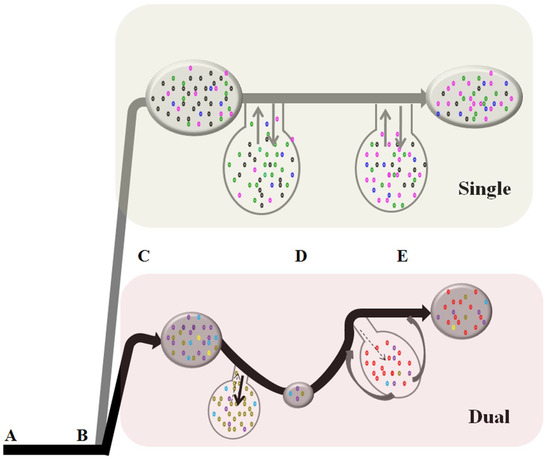 Schematic model of the dynamics of FIVC in single and dual infection. Key elements of FIVC infection dynamics in dual infected cats are indicated with letters. A: Initial infection of 10 cats with PLV or sham inoculated. B: (28 days post PLV infection); Infection of five cats in each group with FIVC (4 groups total). C: Peak effective population size one week after FIVC infection. D: Population bottleneck between week 3–7 in dual infected cats. E: FIVC recovery from bottleneck. The black and grey lines represent changes in FIVC effective population size from dual and single infected cats, respectively. The circles along the lines are proportional to FIVC population size in PBMC and circles adjacent to the line represent hypothetical dynamics of virus infection in peripheral tissues. The number and color of dots in each tissue ‘circle’ represent genetic diversity in each FIVC population. Possible mechanisms for the bottleneck related to changes in infected cell dynamics include decreased immigration of infected cells from peripheral tissues to blood (dashed arrow) or increased emigration from peripheral blood to tissues (bold arrow). The recovered population (E) in dual infected cats has unique substitution features (see text) suggesting that the majority of infected cells sampled in peripheral blood might be coming from a tissue compartment or cell type not represented in the pre-bottleneck sample (indicated by the curved arrows). An alternative explanation is that the recovered population derives from a genetically impoverished population depicted at D that survived the bottleneck. The population size of FIVC in single infection is stable throughout this period (C–E).