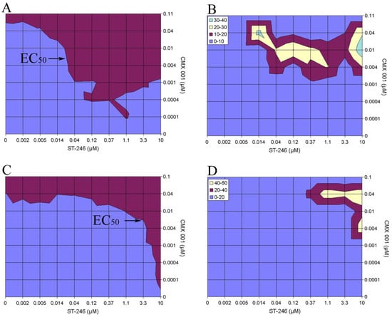 24]. While strong synergistic activity was found against vaccinia virus with very low doses across a broad range of combinations, higher concentrations of ST-246 were required for producing similar synergy with cowpox virus (