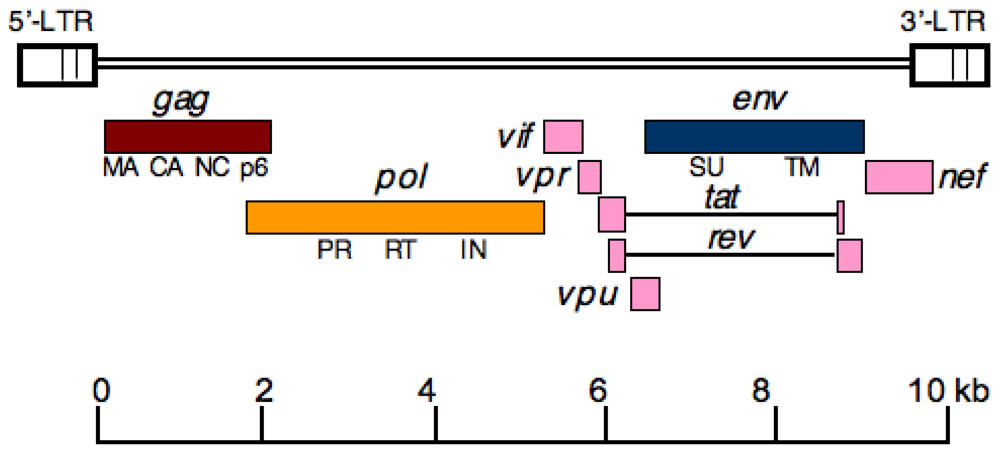 Genomic organization of HIV-1. The rectangles indicate the open reading frames for the gag (brown), pol (yellow), and env (blue) genes. Complex retroviruses like HIV-1 encode additional regulatory and accessory genes (shown in pink). Tat and Rev introns are depicted as horizontal lines. The major Gag domains matrix (MA), capsid (CA), nucleocapsid (NC), and p6 and the Env surface (SU) and transmembrane (TM) glycoproteins (gp120 and gp41, respectively, in the case of HIV-1) are indicated. The 5’ and 3’ long terminal repeats (LTRs) are also shown.
