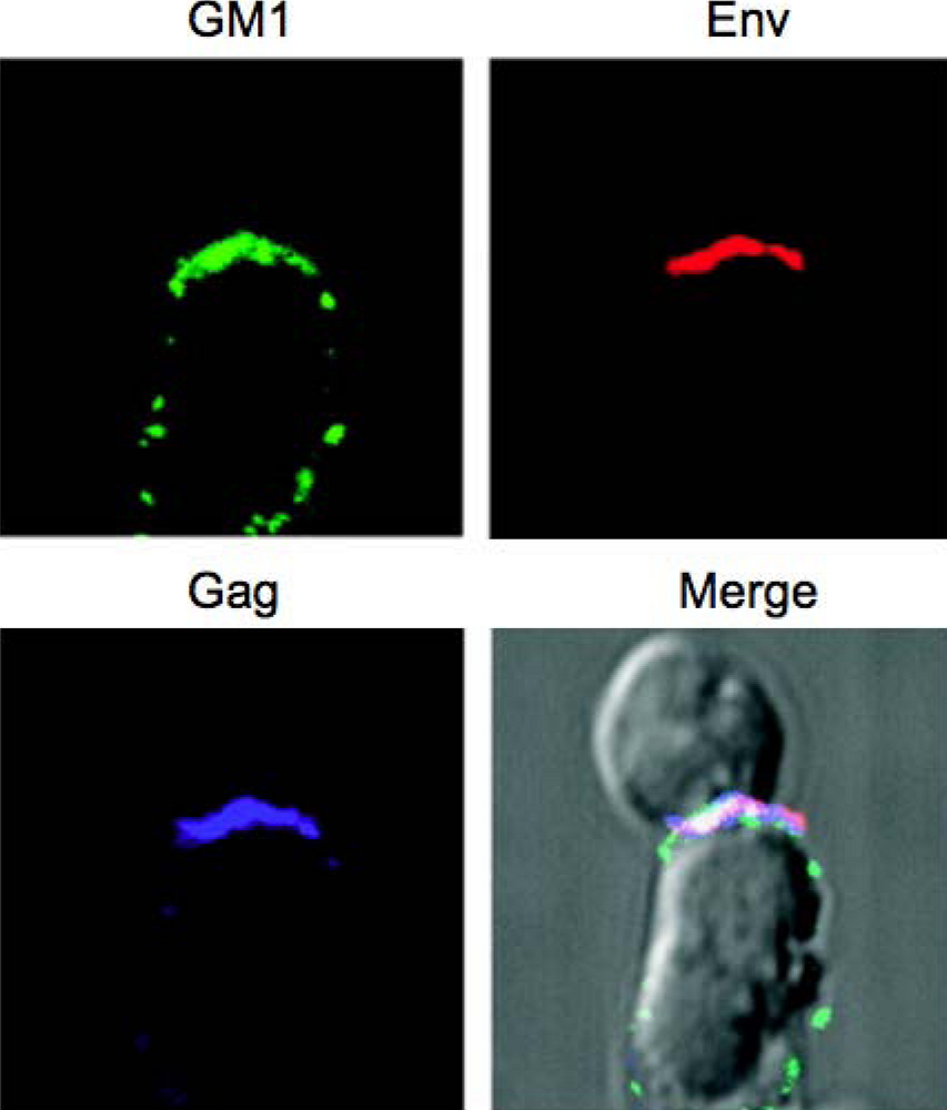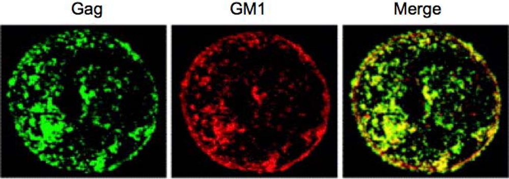 Copatching of HIV-1 Gag proteins with the raft marker GM1. Before fixation, Jurkat cells expressing HIV-1 Gag were treated with cholera toxin B subunit to stain GM1. Cells were then fixed, permeabilized, and Gag proteins were detected with an anti-p17 MA antibody. Gag and GM1 show colocalization, as shown in yellow in the merged image. Reprinted with permission from Ono and Freed [1]. Copyright 2005, Elsevier Inc.