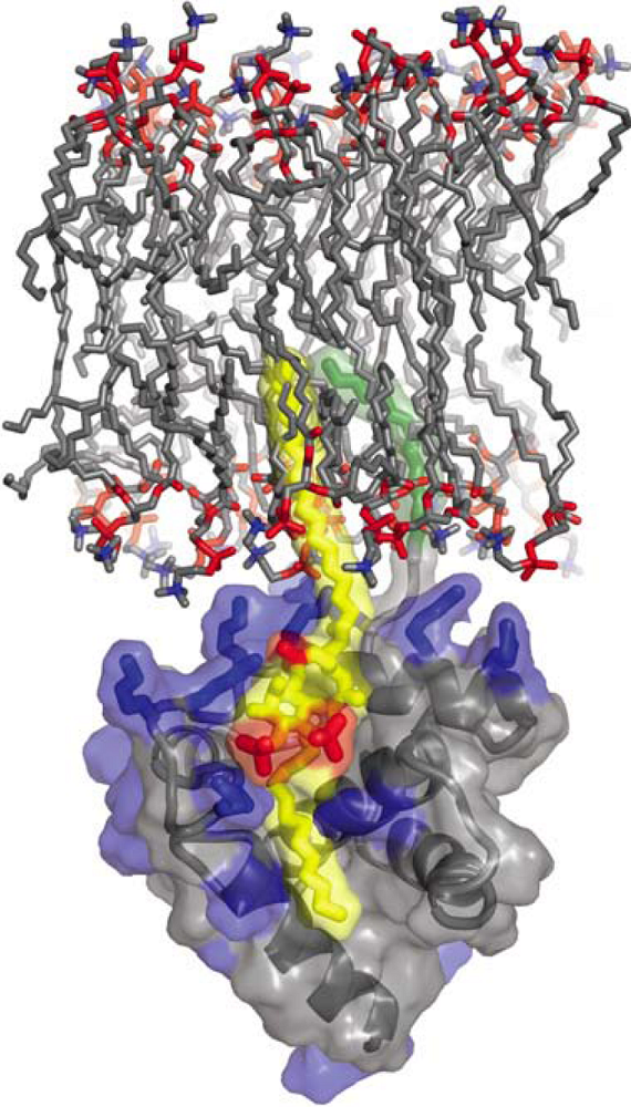 Complex between HIV-1 MA and PI(4,5)P2. The highly basic surface of MA (blue) exhibits electrostatic interactions with PI(4,5)P2 (yellow and red phosphates). The 2’-unsaturated acyl chain of PI(4,5)P2 (yellow) binds to the hydrophobic cleft in MA and the myristyl group (green) of MA inserts into the lipid bilayer. Unpublished image provided by Dr. M. Summers, based on the data of Saad et al. [124].
