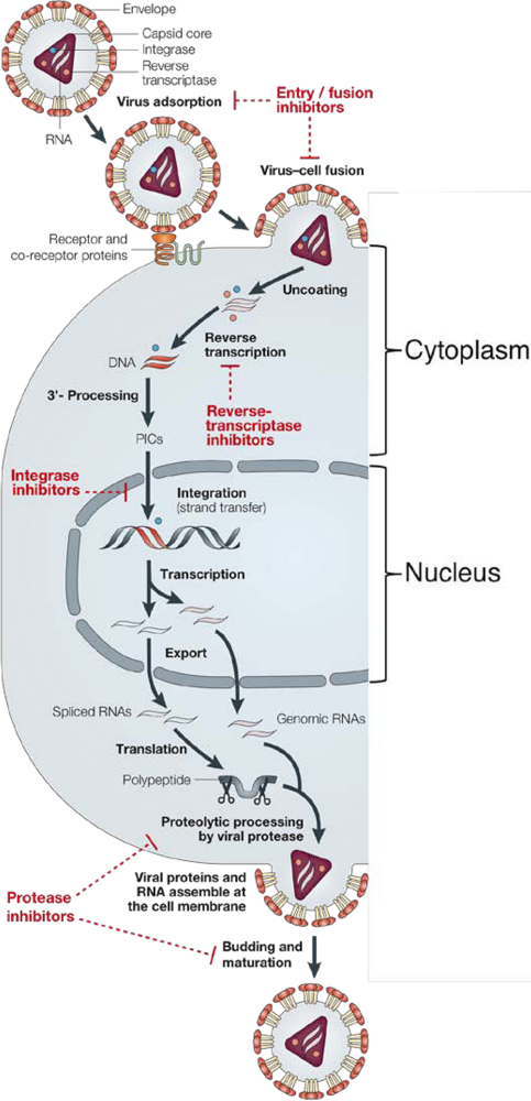 HIV-1 life cycle. HIV-1 first binds cells via interactions between the viral glycoproteins gp120/gp41 and the cellular receptor CD4 and CCR5 or CXCR4 co-receptors. After a conformational change of the complex, gp41 allows the fusion of both viral and cellular membranes, leading to the release within the cytoplasm of the viral core. The viral RNA (two copies of single-stranded RNA) is reverse-transcribed by the viral reverse transcriptase (RT) into double-stranded DNA. This DNA is then processed by the viral integrase (IN) and organized within a large nucleoprotein complex, the pre-integration complex (PIC). Following nuclear translocation, IN catalyzes the integration of this same DNA within the host genome (strand transfer, ST). After transcription, the viral RNA can be exported as genomic RNA (non-spliced) or as mRNAs (spliced RNA). The spliced RNA is translated into viral polyproteins that are cleaved by the viral protease (PR) and associate with genomic RNA at the cell membrane. Maturation by PR leads to new infectious particles released from the infected cell by budding. Drug targets include four different steps of viral replication: entry/fusion, reverse transcription, integration, and maturation (red). (Adapted from [3]).
