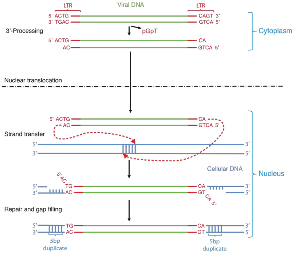 The integration process. IN catalyzes the integration of the HIV DNA within the cellular DNA in two distinct steps. First, IN cleaves the dinucleotide GT at both 3’ extremities of the viral DNA (red) by 3’-processing (3’-P). After nuclear import, the strand transfer (ST) reaction leads to the integration of the viral DNA (green) into the cellular DNA (blue). Cellular proteins then repair the newly created junctions, cleave the overhangs and fill the gaps, duplicating five bases of the cellular DNA on each side.