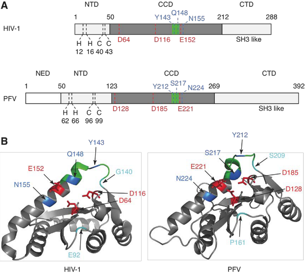 HIV-1 and PFV IN structures. A. Comparison of the primary structures of HIV-1 and PFV IN. N-terminal (NTD) and C-terminal domains (CTD) are represented in light gray and catalytic core domains (CCD) in dark gray. The DDE motif is colored in red and mutations conferring resistance to RAL (positions 143, 148 and 155 for HIV-1; 212, 217 and 224 for PFV IN) are highlighted in blue. The flexible loop, comprising amino acids 140-149 for HIV-1 IN or 209-218 for PFV IN, is colored in green. B. Three-dimensional structure of HIV-1 and PFV IN core domains. Colors correspond to scheme A. In addition, amino acids 92 and 140 for HIV-1 IN and 161 and 209 for PFV IN are highlighted in light blue. Cartoon representations were obtained using MacPyMol version 0.99rc6 and the pdb file 2B4F (HIV-1 IN core domain, residue 57-207, with mutations F185K) and 3L2R (PFV IN complete structure with viral DNA and Mg/ Zn cations, residue represented 123-269).