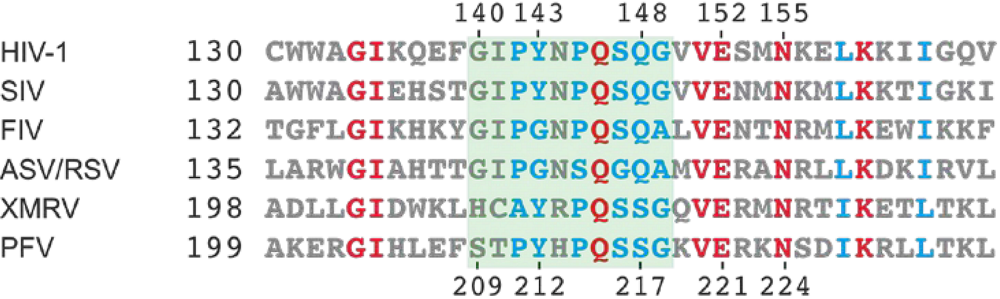 Amino acid alignment of the flexible loop region from different retroviruses. Alignment of the amino acid sequences corresponding to the region around the flexible loop of HIV-1, simian immunodeficiency virus (SIV), FIV, avian/Rous sarcoma virus ASV/RSV, xenotropic murine leukemia-related retrovirus (XMRV) and PFV. The flexible loop region is shaded in green. Residues identical in all the retroviruses are colored in red, and conserved residues with only one amino acid difference existing between the retroviruses are colored in blue. Numbers refer to the first residue for each sequence. Numbering at the top of the alignment corresponds to HIV-1 IN residues involved in resistance to RAL and to the catalytic glutamic acid (E152). Numbering for PFV IN is reported underneath the alignment.