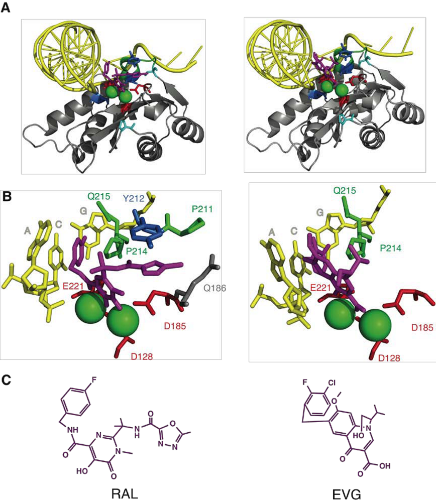 Crystal structures of PFV IN in complex with INSTI. A. Three-dimensional structure of the PFV IN core domain in complex with its viral DNA substrate and RAL (left) or EVG (right) in the presence of magnesium. The core domain (amino acids 123-269) is colored in grey. Positions 212, 217 and 224, corresponding positions 143, 148 and 155 in HIV-1 IN are highlighted in blue. Positions 161 and 209, corresponding to secondary mutation positions 92 and 140 for HIV-1 IN, are highlighted in cyan. Cartoon representations were obtained using MacPyMol version 0.99rc6 and the pdb files 3L2T (RAL) and 3L2U (EVG) containing the PFV IN complete structure with viral DNA and Mg2+/Zn2+. B. Close view of the active site containing RAL (left) or EVG (right). Only the residues of PFV IN and the bases of the viral DNA within 5 Å of the drug are represented as sticks. Colors are similar to panel A. C. RAL (left) and EVG (right) chemical structures oriented as in the PFV IN structure in panel B.
