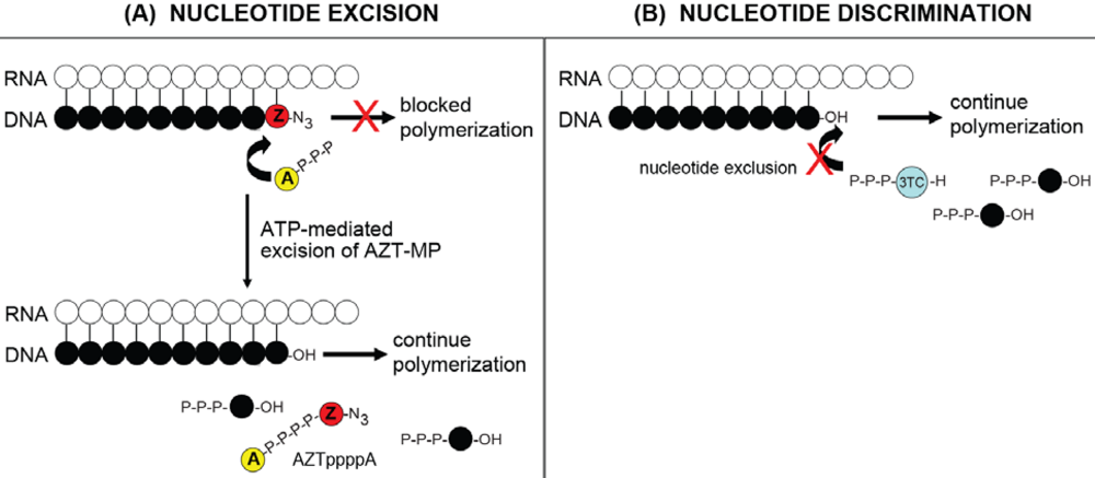 Mechanisms of NRTI resistance. (A) Nucleotide excision. Mutations in pol, such as TAMs, aid in the ATP-mediated removal of an incorporated AZT monophosphate (AZT-MP) yielding an AZTppppA excision byproduct. (B) Nucleotide discrimination. Mutations in pol cause steric hindrance at the pol active site, excluding certain drugs, for example 3TC, from being incorporated during reverse transcription. Both examples yield a complex competent for polymerization. Yellow circle with the letter A and three phosphates, ATP; black circles with three phosphates, dNTPs; red circle with the letter Z and the N3 azido group, AZT-MP; blue circle with three phosphates, 3TC-triphosphate; P, phosphate group. RNA is depicted with white circles; DNA is depicted with black circles.