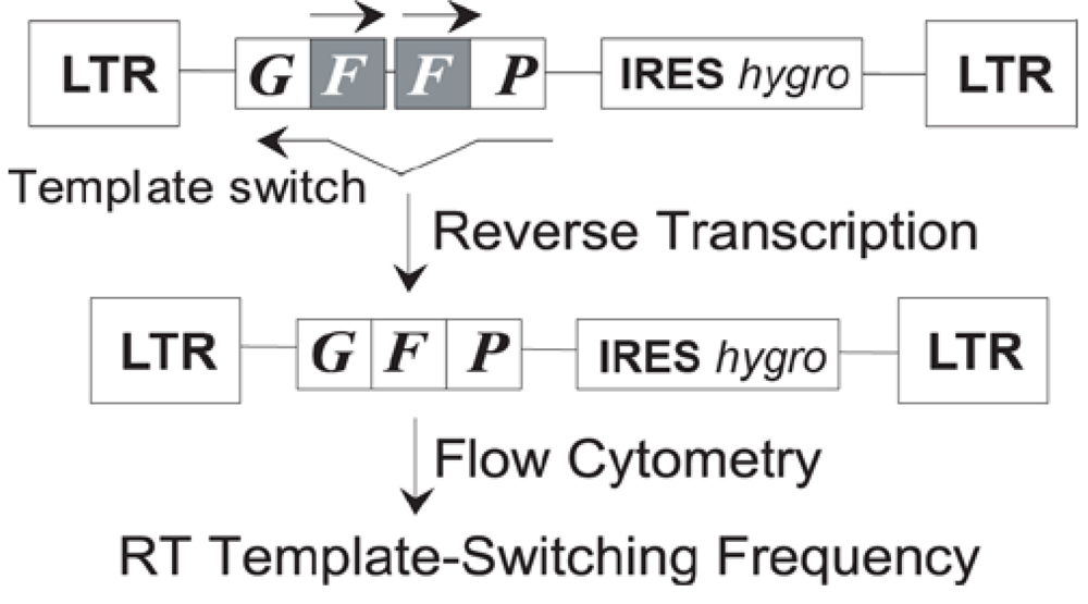 Single-cycle direct repeat deletion assay to determine the percentage of template switching in vivo. Proviruses containing a direct repeat (horizontal arrows) of the green fluorescent protein gene (GFP) were mobilized and used to infect target cells. The frequency of a homologous template switch during reverse transcription in target cells, which reconstitutes a functional GFP gene, was measured by flow cytometry. IRES, internal ribosomal entry site; hygro, hygromycin gene; LTR, long terminal repeats.