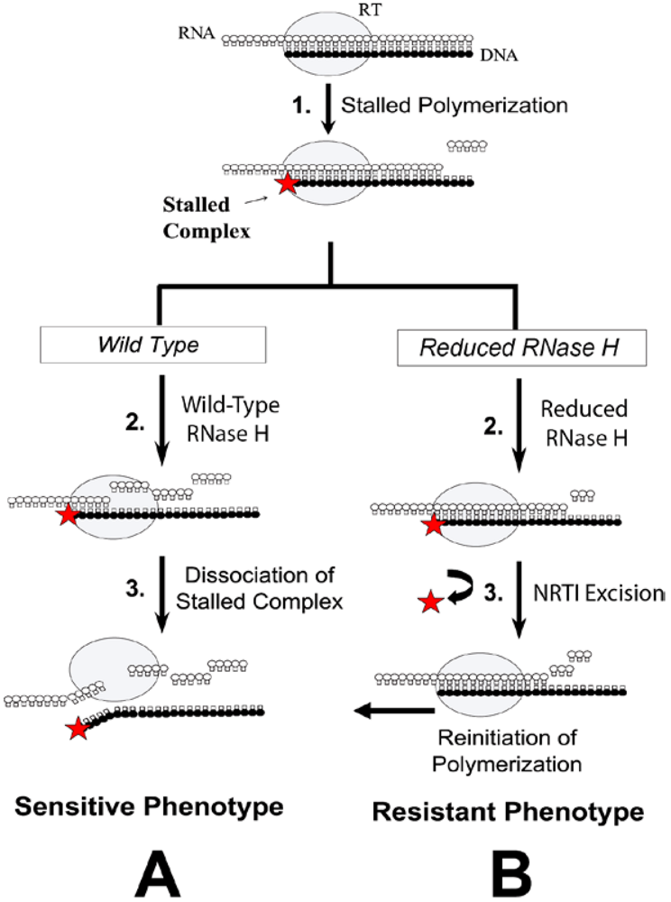 Mechanisms of C-terminal domain NRTI resistance. During reverse transcription, incorporation of AZT leads to a complex stalled for polymerization. (A) In the case of a wild-type RT with wild-type RNase H activity, the stalled complex leads to a dissociation of the complex and sensitive phenotype as RNase H cleavage causes minimal stretches of homology to be retained between the RNA/DNA hybrid. (B) In the case of an RT with reduced RNase H activity, the decrease in template RNase H cleavage allows longer stretches of homology to be retained between the RNA/DNA hybrid giving more time for the pol active site to undergo nucleotide excision and reinitiate polymerization, leading to a resistant phenotype. Gray oval, reverse transcriptase; star, AZT; white circles, RNA; black circles, DNA.
