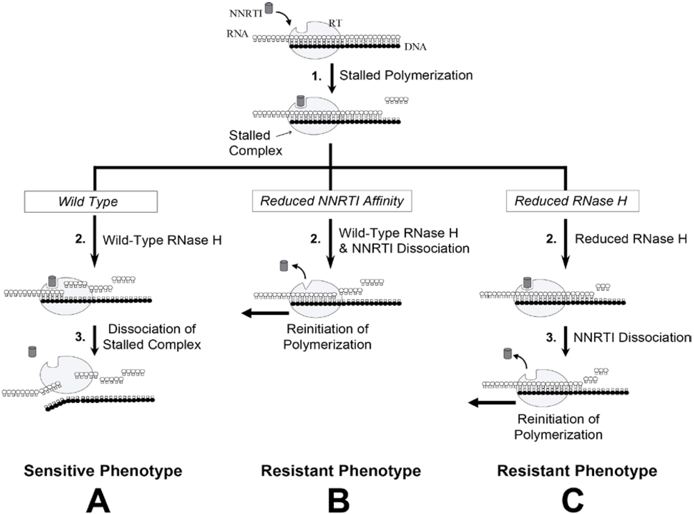 Nikolenko and colleagues have proposed that increases in NNRTI resistance observed with C-terminal domain mutations can also be explained by decreases in RNase H cleavage [86]. This model suggests a mechanism that is parallel to the RNase H-dependent mechanism of NRTI resistance outlined in Figure 3. When the NNRTI affinity to the wild-type RT is not affected by mutations and when the RNase H activity is wild-type, binding of the NNRTI to RT during reverse transcription forms a stalled complex, leading to dissociation of the reverse transcription complex and a sensitive phenotype (Figure 4A). As expected, NNRTI binding pocket mutants will decrease NNRTI binding to RT, and will increase NNRTI dissociation from the RT, leading to a resistant phenotype (Figure 4B). Mutations in cn and rh that reduce RNase H cleavage will allow more time for the NNRTI to dissociate from the NNRTI-RT-template/primer complex (NNRTI-RT-T/P), allowing the resumption of DNA synthesis and thereby resulting in enhanced NNRTI resistance (Figure 4C). In addition, combining mutations in RT that reduce NNRTI affinity with mutations in RT that reduce RNase H cleavage should further increase NNRTI resistance.