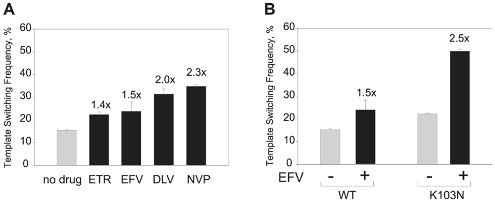 Effect of different NNRTIs on the frequency of RT template switching by wild-type and K103N mutant RTs (A) The effect of NNRTI treatment on the template switching frequency by wild type HIV-1 RT is dependent on the affinity of NNRTI to the RT. (B) Effect of decreased affinity of EFV to the drug resistant K103N mutant RT on the template switching frequency. Figure represents data described in[86].