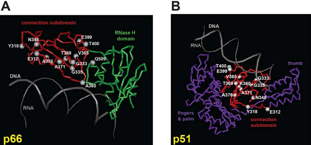 Drugs targeted to RT fall into two classes: nucleoside RT inhibitors (NRTIs) and non-nucleoside RT inhibitors (NNRTIs). Currently there are eight NRTIs (abacavir [ABC], zidovudine [AZT], zalcitabine [ddC], didanosine [ddI], stavudine [d4T], emtricitabine [FTC], lamivudine [3TC], and tenofovir disoproxil fumarate [TDF]) and four NNRTIs (delaviridine [DLV], efavirenz [EFV], etravirine [ETR], and nevirapine [NVP]) approved for use in treatment of HIV-1 infection. NRTIs are nucleoside analogs that lack the 3ʹOH on the sugar ring and competitively block reverse transcription by causing chain termination during DNA polymerization [10,11]. NRTIs are prodrugs that require intracellular phosphorylation to the 5ʹ-triphosphate form by host cell kinases in order to become active. On the other hand, NNRTIs in general are non-competitive inhibitors of RT that bind to a hydrophobic pocket near the polymerase active site, inducing conformational changes that inhibit RT enzymatic activity [12]. As expected, treatment with either or both classes of drugs causes the emergence of drug resistance mutations generally clustered around the NRTI or NNRTI binding sites.