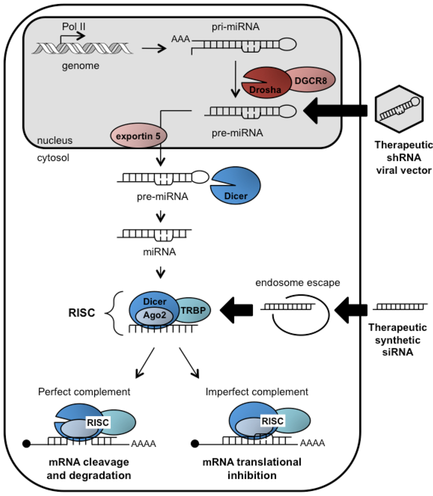 RNAi has become a preferred method to perform highly specific genetic manipulations for functional studies in cell culture. RNAi studies have also greatly expanded the repertoire of possible drug targets to treat metabolic and genetic disorders, cancer, or viral infections. The underlying principle for RNAi-based therapy is to trigger PTGS using mimics of Dicer substrates (Figure 1): either chemically synthesized siRNAs or virally expressed shRNAs. Synthetic siRNAs can be delivered to Dicer in the cytosol by a variety of delivery approaches. shRNAs encoded in viral delivery vectors must be exported and processed by the endogenous miRNA pathway.