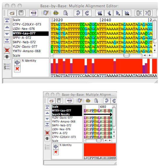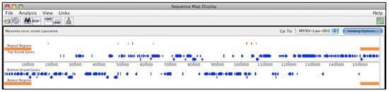 - Upton, C. Screening predicted coding regions in poxvirus genomes. Virus Genes 2000, 20, 159–164. [Google Scholar] [CrossRef] [PubMed]