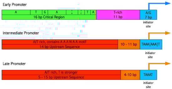 Visualization of the sets of JaPaFi results for various parameter combinations against genome maps indicated that most of the hits mapped to regions overlapping and immediately upstream of the transcription start sites (promoter elements) of poxvirus genes. Poxvirus genes are temporally regulated at the transcription level by means of three classes of structurally distinct promoters, active at early, intermediate and late stages of the viral life cycle (Figure 4) [25]. To verify this observation, known motifs associated with the three temporal classes of poxvirus promoters were identified in logos of the hits in order to delineate putative promoter elements and visualize whether or not the hits are longer than expected once promoter elements are accounted for [13,14,26,27].