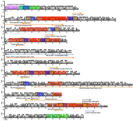 Annotated hit logos showing promoter elements; the hit number is indicated underneath (left) each logo. Blue arrows represent early genes, orange arrows represent late genes, and blue-and-orange striped arrows represent genes that are transcribed both early and late in the poxvirus life cycle. Highlighted promoter elements follow the color key shown in the diagram of the known consensuses of promoters (Figure 4).