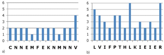 Histograms showing the degeneracy of each amino acid in the protein sequences corresponding to (a) Hit05 and (b) Hit06.