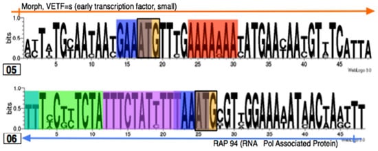 The results show that Hit05 is indeed made up of amino acids with relatively low codon degeneracy, including two methionine residues; this may explain the high conservation of this region. However, this does not seem to be the situation for Hit06, which is made up of amino acids with two- to six-fold codon degeneracy. Thus, the DNA conservation is not explained by amino acid conservation with low degeneracy codons. Interestingly, Hits 05 and 06 contain motifs that closely resemble poxvirus promoter elements, even with respect to their overlap with ATG (Met) codons (Figure 10).