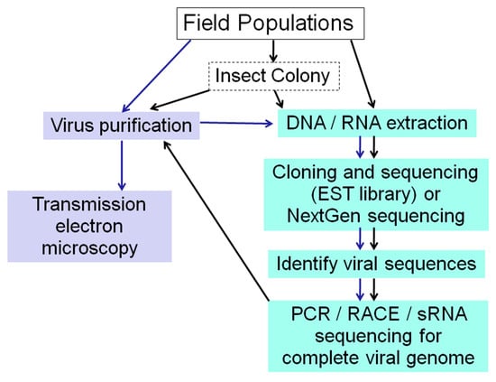 The first virus discovered was Tobacco mosaic virus (TMV) discovered by Dmitri Iwanowsk, a Russian botanist in 1882. He showed that extracts from diseased tobacco plants could transmit disease to other plants after passage through ceramic filters that were sufficiently fine to retain bacteria. The first virus particles (TMV) were observed following the invention of the electron microscope in 1931. Although it was known from the 1930s that viruses consisted of a protein shell and nucleic acids, methods for detection of viral protein and viral genomic RNA or DNA were not developed until the late 1970s and early 1980s. Conventional approaches for virus discovery are to collect insects from multiple populations from multiple locations, and use several micrograms of material at minimum for virus purification. Virus purification protocols vary, but material is typically homogenized, centrifuged and filtered under sterile conditions. Further purification may include ultracentrifugation and sucrose or cesium chloride gradient steps. The sample may then be used for visualization of virus particles by electron microscopy, infection of cultured insect cells and observation for cytopathic effects [,,], and infection of insects by spraying, injection or oral inoculation to fulfill Koch’s postulates. Viruses would then be identified and further characterized by use of serological methods and nucleic acid hybridization (where specific antisera or probes are available), molecular cloning and genomic sequencing []. Use of a cell line is beneficial in that it allows for culture and amplification of viruses that cause either acute or covert infections in the host. However, the lack of appropriate insect cell lines for such virus screens is a common limiting factor and it cannot be assumed that all viruses present in an insect would replicate in a given cell line.