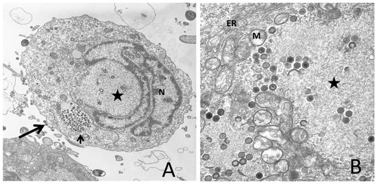 Ultrastructural analysis of FV3-infected FHM cells. (A) An FV3-infected cell displaying virions budding from the plasma membrane (long arrow) or present within a paracrystalline array (short arrow), a viral assembly site (star), and the nucleus (N) showing chromatin condensation; (B) an enlargement of a viral assembly site (star) showing both full and empty virions and possible assembly intermediates. The assembly site is surrounded by mitochondria (M) and membraneous structures, possibly elements of the endoplasmic reticulum (ER).