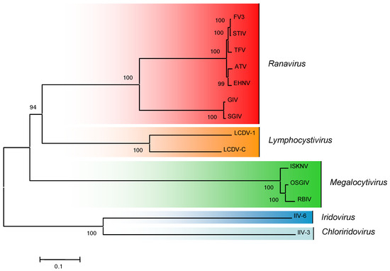 Frog virus 3 (FV3) is the type species of the genus Ranavirus (family Iridoviridae) [1,2,3]. The genus Ranavirus is one of five genera within the family: members of the Ranavirus, Megalocytivirus, and Lymphocystivirus genera infect cold-blooded vertebrates (amphibians, reptiles and bony fish, i.e., superclass Osteichthyes), whereas members of the remaining two genera (Iridovirus and Chloriridovirus) infect invertebrates, e.g., insects and crustaceans. The family Iridoviridae is phylogenetically linked to several other families of nuclear, cytoplasmic, large, DNA-containing viruses (NCLDV) such as Phycodnaviridae, Poxviridae, Asfaviridae, Ascoviridae, and Mimiviridae [4,5,6,7]. Because one of the genus designations (Iridovirus) is a variation of the family name, viruses within the family are generically referred to as iridovirids.