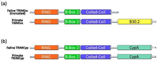 McEwan et al. discovered that Feliformia express a truncated TRIM5 gene, which explains why feline cells do not show a TRIM5-typical restriction to retroviruses (Figure 2) [14]. The feline mRNA of TRIM5 contains a premature stop codon expressing a RBCC protein without the B30.2 domain (Figure 3a). In cats, the missing B30.2 domain is not replaced by CypA as seen in some monkeys [14]. The truncated feline TRIM5 appears to be without any antiretroviral activity as overexpression of the feline TRIM5 does not prevent infection with murine leukemia virus, HIV-1 or a simian immunodeficiency virus (SIV) of macaques (SIVmac) [14]. However, it is possible that the truncated feline TRIM5 protein is similar to the human TRIM5α involved in LPS-mediated signaling [67], potentially explaining why this gene is retained in Feliformia. Interestingly, a synthetic fusion of the feline TRIM5 to the feline CypA (Figure 3b) generated a potent inhibitor of FIV and HIV-1 [75,83]. These results show that the RBCC domains of feline TRIM5 retain their intrinsic antiviral function.