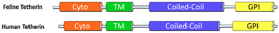Schematic structure of feline and human tetherin. Tetherins from both species share their principal elements: Cytoplasmatic (Cyto)-, transmembrane (TM)-, coiled-coil- and glycophosphatidyl-inositol (GPI)-anchor domains.