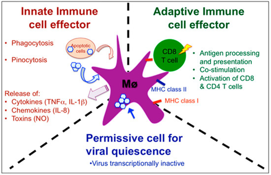 Schematic view of the complex role of macrophages in Xenopus host defenses against RV. As innate immune cell effectors, macrophage can acquire viral antigen by direct infection, pinocytosis of opsonized viruses or phagocytosis of infected cells, as well as release cytokines, chemokines and toxins that contribute to limiting the infection. As an adaptive immune cell effector, macrophages process and present viral antigens through MHC class I and class II pathways, up-regulated co-stimulatory molecules (B7, CD40) and activate anti-RV CD8 and CD4 T cells. Finally, macrophage can harbor quiescent RV in asymptomatic frogs.