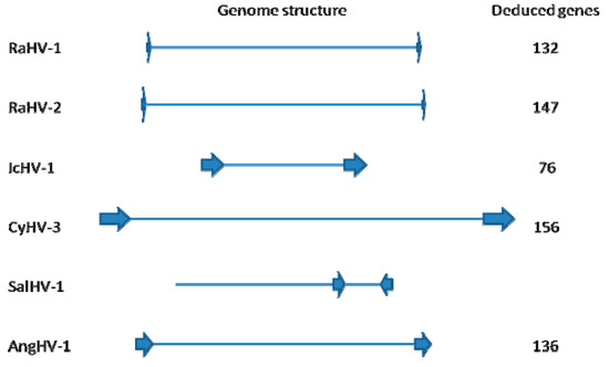 Genome sequencing has revealed the structural characteristics of the Alloherpesviruses. Of the six structurally evaluated genomes, all are packaged as unit length, linear genomes ranging in size from 134 kb (IcHV1 one of the smaller herpesviruses), to the largest known herpesvirus genome, 295 kb (CyHV3) (Figure 1). Five are arranged with terminal direct repeat sequences. The terminal repeats range from in size from 636 bp in RaHV2 [5] to 22 kb in CyHV3 [3]. The exception is SalHV1 [58]. Its 174.4 kb genome is composed of a 133.4 kb unique long sequence, and a 25.6 Kb unique short fragment flanked by 7.7 kb inverted repeats. This structure allows two isomeric orientations of the unique short fragment similar to the genome structure of the varicella-zoster virus (VZV) a mammalian alphaherpesvirus [60].