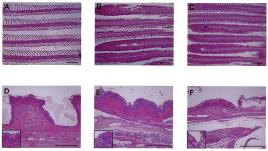 Photomicrographs of histological sections of the gills of CyHV-3 infected. (A to C) Gill filaments. (A) Uninfected. (B) 2 days post infection (p.i.) many lamellae are infiltrated by inflammatory cells. (C) 6 days p.i. all lamellae are heavily infiltrated. (D to F) Gill rakers. (D) uninfected (E) 2 days p.i. increased inflammatory infiltrate is present in the subepithelial zone. (F) 6 days p.i., the inflammatory process is more pronounced, with sloughing of the overlying epithelium (upper right). All of the sections were stained with hematoxylin and eosin. The insets in the lower left corners are of areas in the centers of the respective photomicrograph. Bars, 200 µm. Copyright © American Society for Microbiology [83].