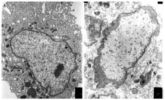 Electron micrographs of (A) non-infected and (B) CyHV-3 infected cells at 3 d.p.i. Arrows indicate margination of chromatin in the infected nucleus, arrow heads show viral capsid accumulation in the central and peripheral zones of the nucleus.