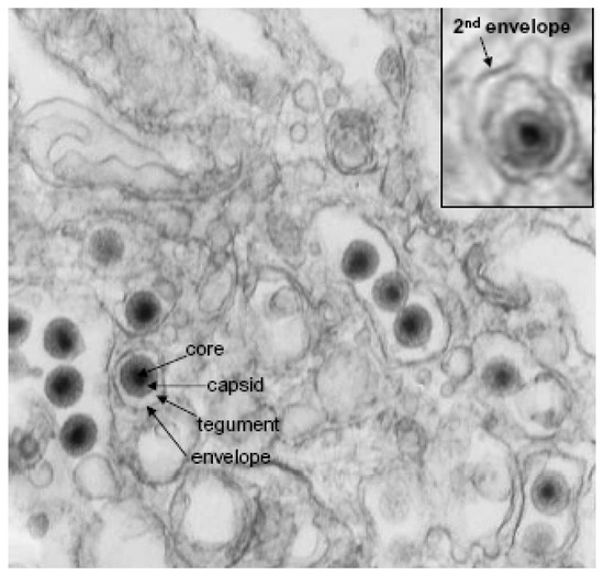 Electron micrographs of CyHV-3 infected CCB cells showing the ultrastructure of mature virions in the cytoplasm. Top right insert shows a secondary envelopment of a mature virion at the periphery of the infected cytoplasm.