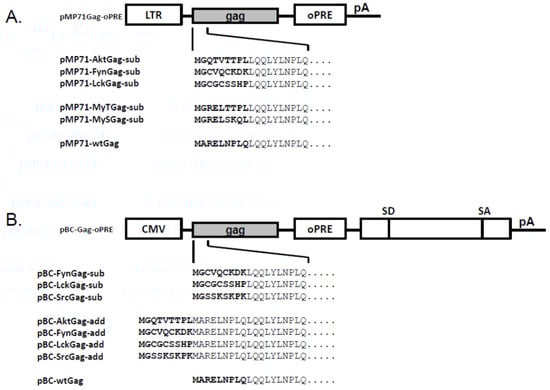 In order to determine whether the Env-independent budding of myristoylated Gag proteins is a shared feature of FVs and not only a specific characteristic of PFV [,], we engineered FFV Gag proteins in such a way that the first nine amino acid residues were replaced (substituted) by known myr-signals of other proteins known to be membrane targeted via this N-terminal protein modification (Figure 1A). The myr-signals were derived from the cellular membrane-associated Akt, Fyn and Lck proteins. These myristoylation-substitution (myr-sub) clones are similar to those used by Life et al. [] for PFV. In addition, we aimed at changing the original FFV Gag sequence with only minimal changes to T- or S-type-like myr-signals with either a serine or threonine at position six starting at the N-terminal Met residue []. The mutations were introduced into an FFV Gag expression construct based on the retroviral vector genome pMP-71 [,].