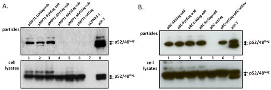 FFV myr-Gag is released as sub-viral particles (SVPs). Proteins of cell lysates and virus particle preparations (as labeled) were harvested 2 days after transfection and assayed for FFV Gag by immunoblotting. (A) 293T cells were transfected with FFV myr-sub Gag expression clones pMP71-LckGag-sub, pMP71-FynGag-sub, pMP71-AktGag-sub, pMP71-MySGag-sub, pMP71-MyTGag-sub (lane 1 to 5), the unmodified parental wt FFV Gag expression clone pMP71-wtGag (lane 6), the full-length FFV genome pCF-7 (lane 8) and control plasmid pcDNA3.1 (lane 7). (B) 293T cells were transfected with FFV myr-add Gag expression clones pBC-AktGag-add, pBC-FynGag-add, pBC-LckGag-add, pBC-SrcGag-add (lane 1 to 4), the unmodified parental wt FFV Gag expression clone pBC-wtGag (lane 5) and the full-length FFV genome pCF-7 (lane 7). In parallel, 293T cells were co-transfected with wt FFV Gag expression clone pBC-wtGag and wt FFV Env expression clone pBC-wtEnv (lane 6). The positions of the FFV p52 and p48 Gag proteins are marked.