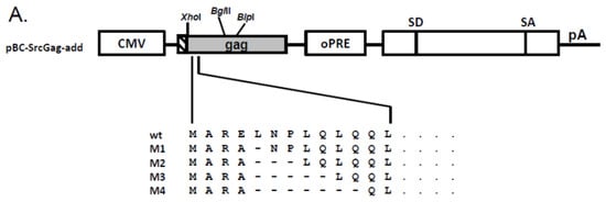 In order to increase overall protein expression [], some of these mutations were subcloned into the pBC12-background which provides a downstream splice acceptor and splice donor pair together with an inserted optimized woodchuck hepatitis virus post-transcriptional regulatory element (oPRE, Figure 1B) []. In addition, the myr-signal of the Src protein was also engineered into the N-terminus of FFV Gag. Except for the expected increase in overall protein expression, the pBC12-based clones were undistinguishable from the pMP-71-based expression clones (data not shown).