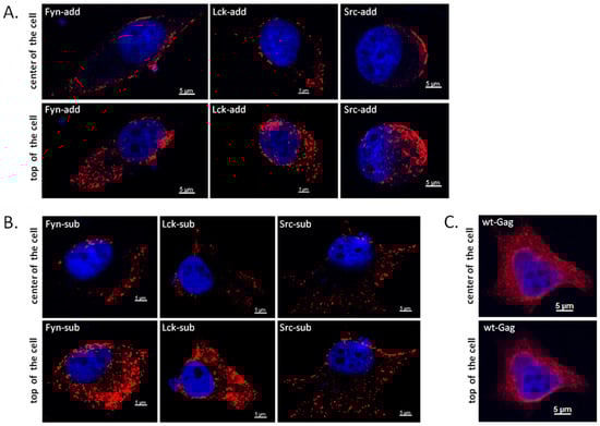 Next, the subcellular localization of WT and myr-Gag proteins was determined. HeLa cells were used for these confocal microscopy studies since 293T cells used in the other experiments are not well-suited for such experiments due to their low cytoplasmatic content. One day after DNA transfection of the HeLa cells with WT and mutant Gag clones, the cells were fixed with para-formaldehyde and subjected to indirect immunofluorescence (IIF) using an FFV CA-specific antiserum as described in the Experimental Section. Representative confocal microscopy images of central and apical sections of Gag-expressing cells are displayed in Figure 5. While WT Gag displays a complex subcellular localization with fine-granular cytoplasmic staining associated with a prominent peri-nuclear staining (panels C), a clear co-localization of any of the myr-add and myr-sub mutants (panels A and B, resp.) with the nuclear periphery is not detectable. In sharp contrast and anticipated upon addition on the membrane-targeting myr-signals to FFV Gag, a strong and consistent association to the plasma membrane is clearly detectable for all myr-Gag proteins. In addition, cytoplasmatic myr-Gag is detectable in a coarse-granular pattern which likely corresponds to a co-localization of myr-Gag proteins with intracellular membrane compartments.