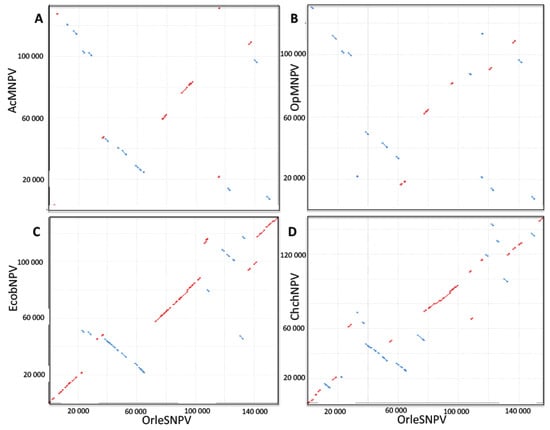 Gene-parity plot analysis. Gene parity comparison of gene order of OrleNPV with (A) Autographa californica MNPV (AcMNPV), (B) Orgyia pseudotsugata MNPV (OpMNPV), (C) Ectropis obliqua (EcobNPV), and (D) Chrysodeixis chalcites NPV (ChchNPV). Blue dots indicate inversions in relation to the OrleNPV gene order. Numbers on the x and y axes are nucleotide position (bp) relative to the polyhedrin start codon.