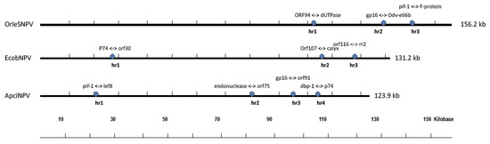 Comparisons of hrs distribution. Linear map showing relative genomic locations of hrs (blue diamond shapes) of closely related baculoviruses; OrleNPV, EcobNPV and ApciNPV. ORFs flanking each of the hrs are indicated above each hr.
