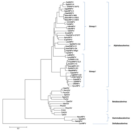 Baculoviruses genomes are characterized by their large, covalently-closed, circular, double-stranded DNA molecules containing numerous open reading frames (ORFs) which are distributed on both strands. Baculoviruses are classified into four genera based on host specificities and phylogenetic analysis; Alphabaculovirus (lepidopteran-specific nucleopolyhedroviruses or NPVs), Betabaculovirus (lepidopteran-specific granuloviruses or GVs), Gammabaculovirus (hymenopteran-specific NPVs), and Deltabaculovirus (dipteran-specific NPVs) [7]. Alphabaculoviruses are subdivided further, based, in part, on the presence of genes encoding different glycoproteins that serve similar functions associated with budded virions (BV), gp64 in group I and f-protein in group II [8,9,10]. Baculovirus genomes range in size from 81,755 bp for Neodiprion lecontei NPV (NeleNPV) to 178,733 bp for Xestia c-nigrum GV (XecnGV) [11,12]. To date, 58 baculovirus genomes including 41 Alphabaculovirus, 13 Betabaculovirus, three Gammabaculovirus and one Deltabaculovirus have been sequenced and are available in the National Centre for Biotechnology Information (NCBI) database (Table 1).