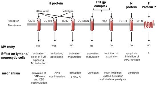 For host entry, MV crosses the respiratory epithelium, and for this, infects tissue resident professional APCs (e.g., dendritic cells (DCs) or macrophages) rather than epithelial cells. Subsequently, MV accesses secondary lymphatic tissues via infected APCs, where efficient replication along with transmission to lymphocytes occurs, essentially enabling viral dissemination to the reticulo-endothelial system and lymphatic tissues [3,5,6,7]. Tissue distribution in the hematopoietic system and pathogenesis of wild-type MV infection in vivo segregates well with the expression pattern of its entry receptor CD150 (also referred to as signaling lymphocyte activation molecule, SLAM), a member of the Ig family, which is confined to cells of the hematopoietic lineage [8,9]. Attenuated or laboratory adapted MV strains can additionally use CD46, a member of the complement regulator family, to which they bind with higher affinity in vitro [10,11]. To what extent interaction with this molecule, which is ubiquitously expressed on all nucleated human cells, determines tissue distribution in vivo has not yet been established. CD150 and CD46 also recruit signaling complexes, which regulate both activation of T cells and the polarity of the T cell response [8,12].