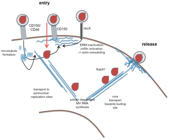 While at least some of the MV receptor interactions outlined above were clearly linked to modulation of cytoskeletal dynamics (which will be detailed below), little is generally known on the role of the cytoskeleton in MV uptake. The role of cytoskeletal dynamics in MV entry has not yet been analyzed. It is, thus, unknown whether MV attachment and entry involves actin-dependent translocation of trapping molecules along filopodial structures as revealed for HIV, or if clustering of entry receptors (especially CD150, see below) might be required. The impact of actin depolymerizing compounds on viral entry has not been studied as yet. MV gp signaling causes moesin and cofilin dephosphorylation on binding to T lymphocytes [22], which promotes actin remodeling, and this has been suggested to enhance microtubule formation. This has been implicated to facilitate transport of lentiviral cores pseudotyped with MV gps towards the nucleus, and may also be important in trafficking of MV cores [23] (Figure 2). Whether this also refers to the intracellular transport of MV cores (which would then specifically apply to hematopoietic cells) has not been resolved.